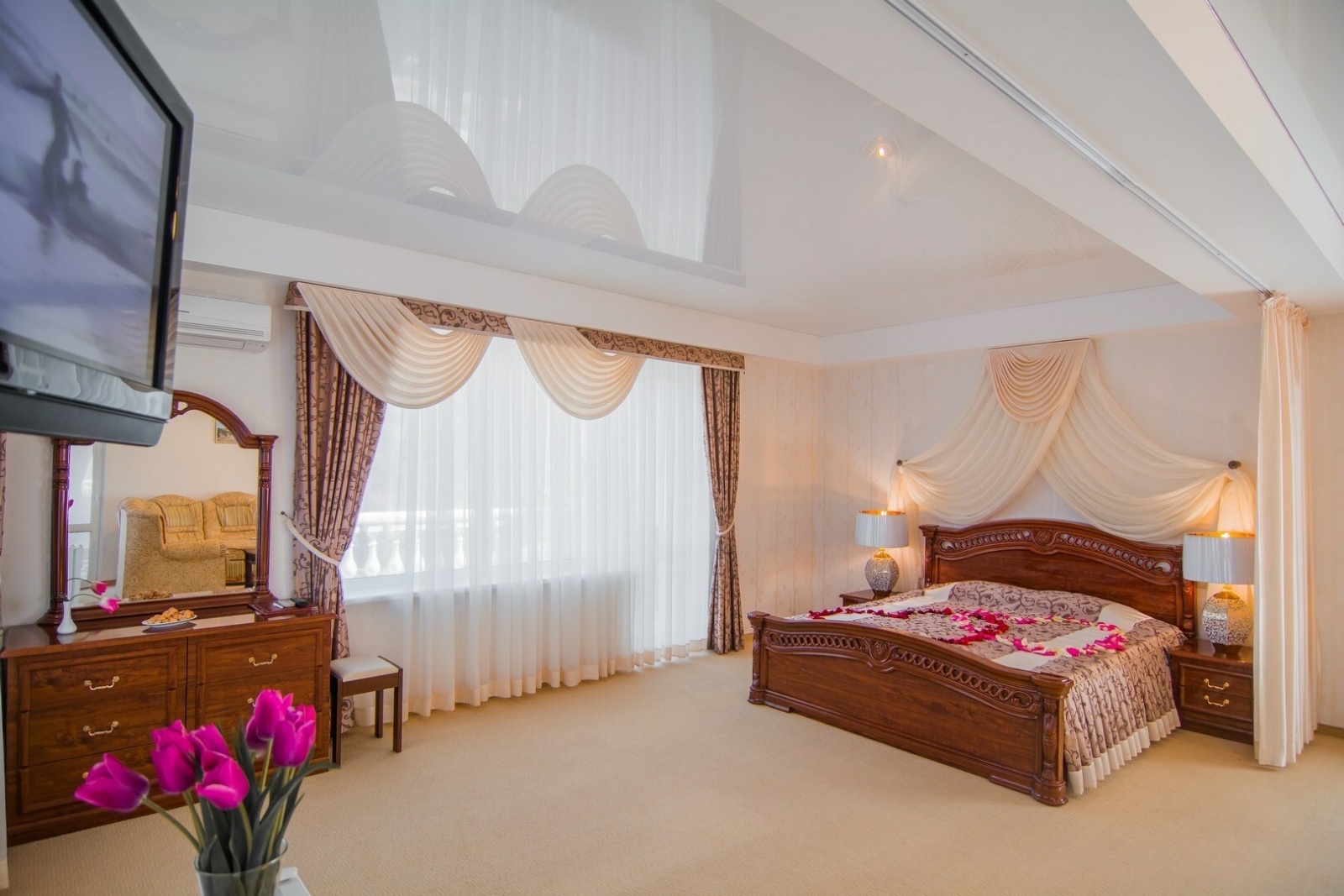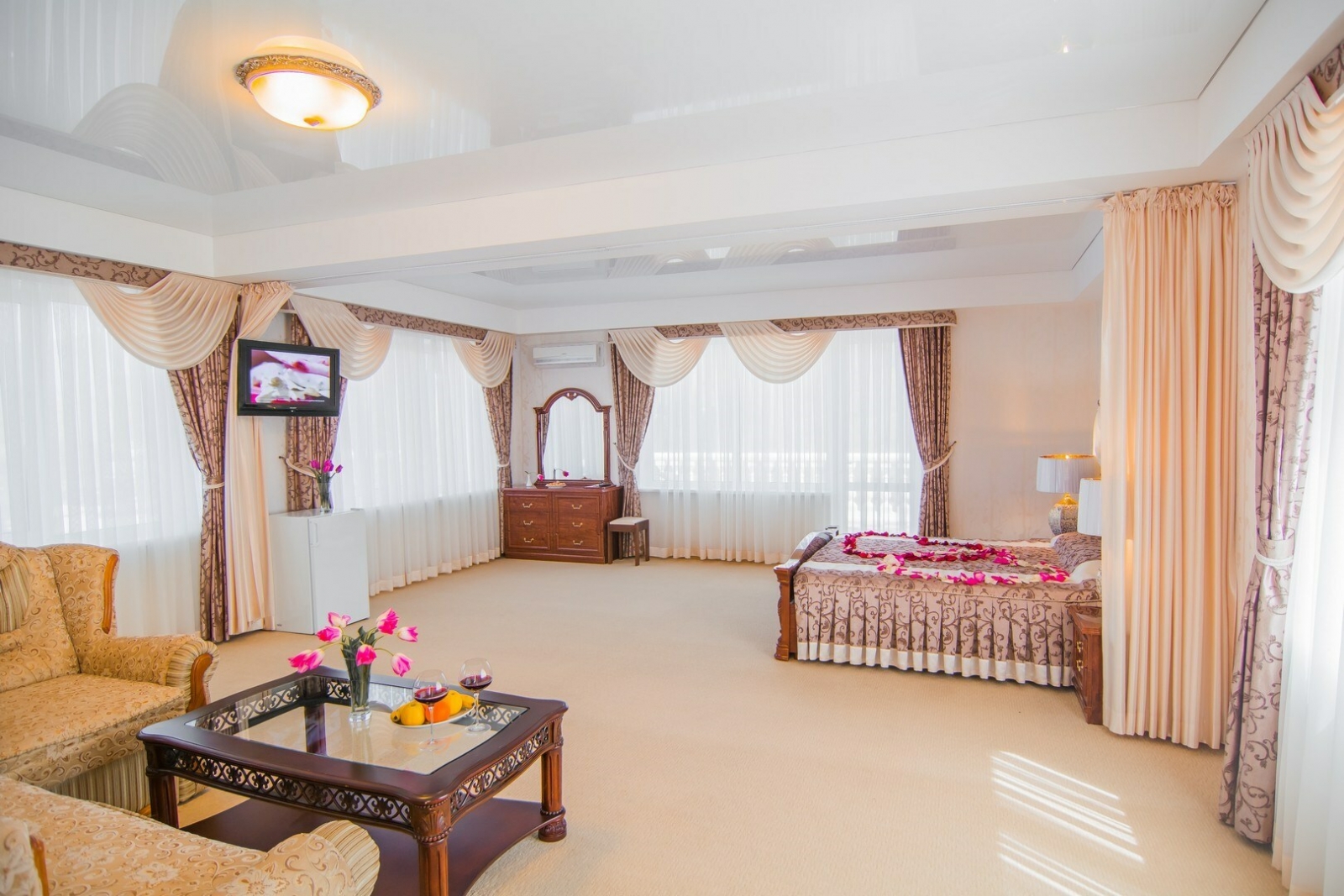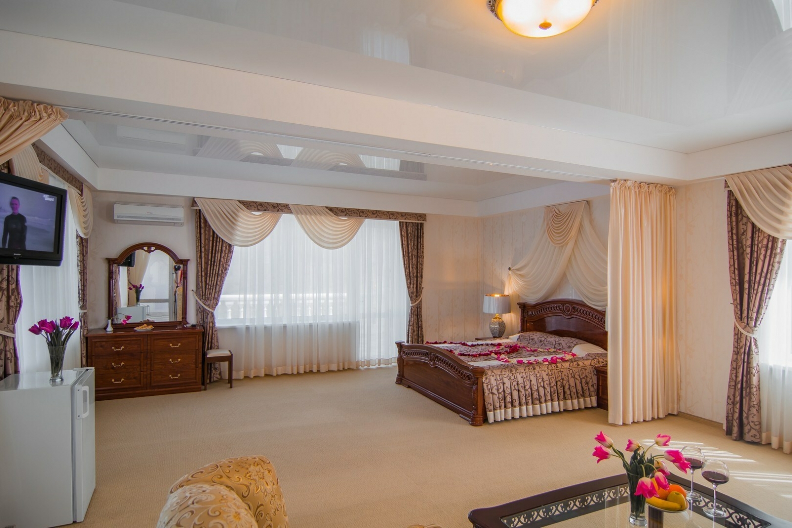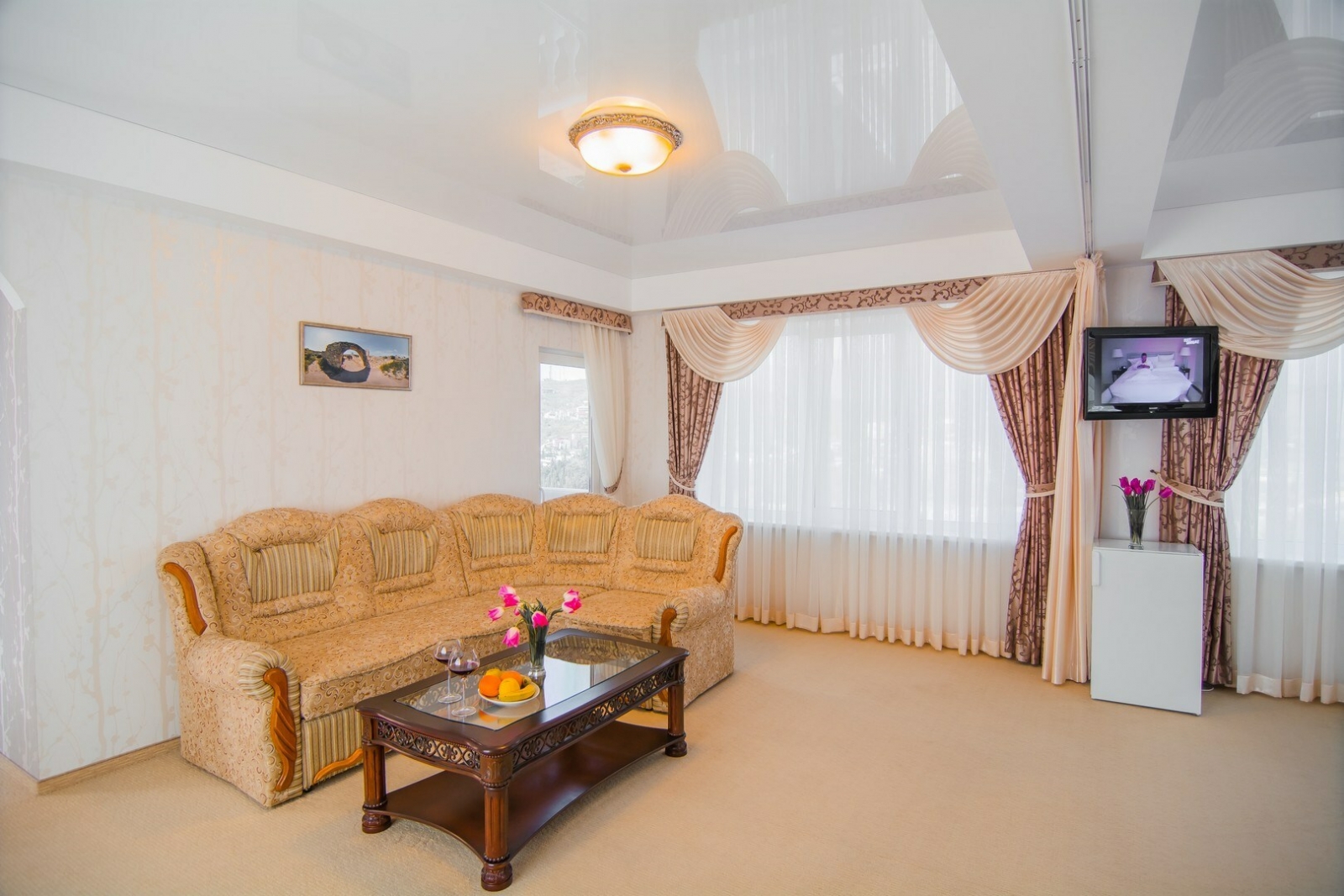 Площадь номера - 54 кв.м. 2 осн. места. 2 доп. места. Балкон. Мебель: диван раскладной, зеркало, комод, кровать двуспальная, прикроватные тумбочки, столик журнальный. Оборудование: кондиционер, набор посуды, сейф, телевизор ЖК, холодильник, электрочайник. Санузел: с ванной, туалетные принадлежности. Сервис: смена полотенец, смена постельного белья, уборка номера.
