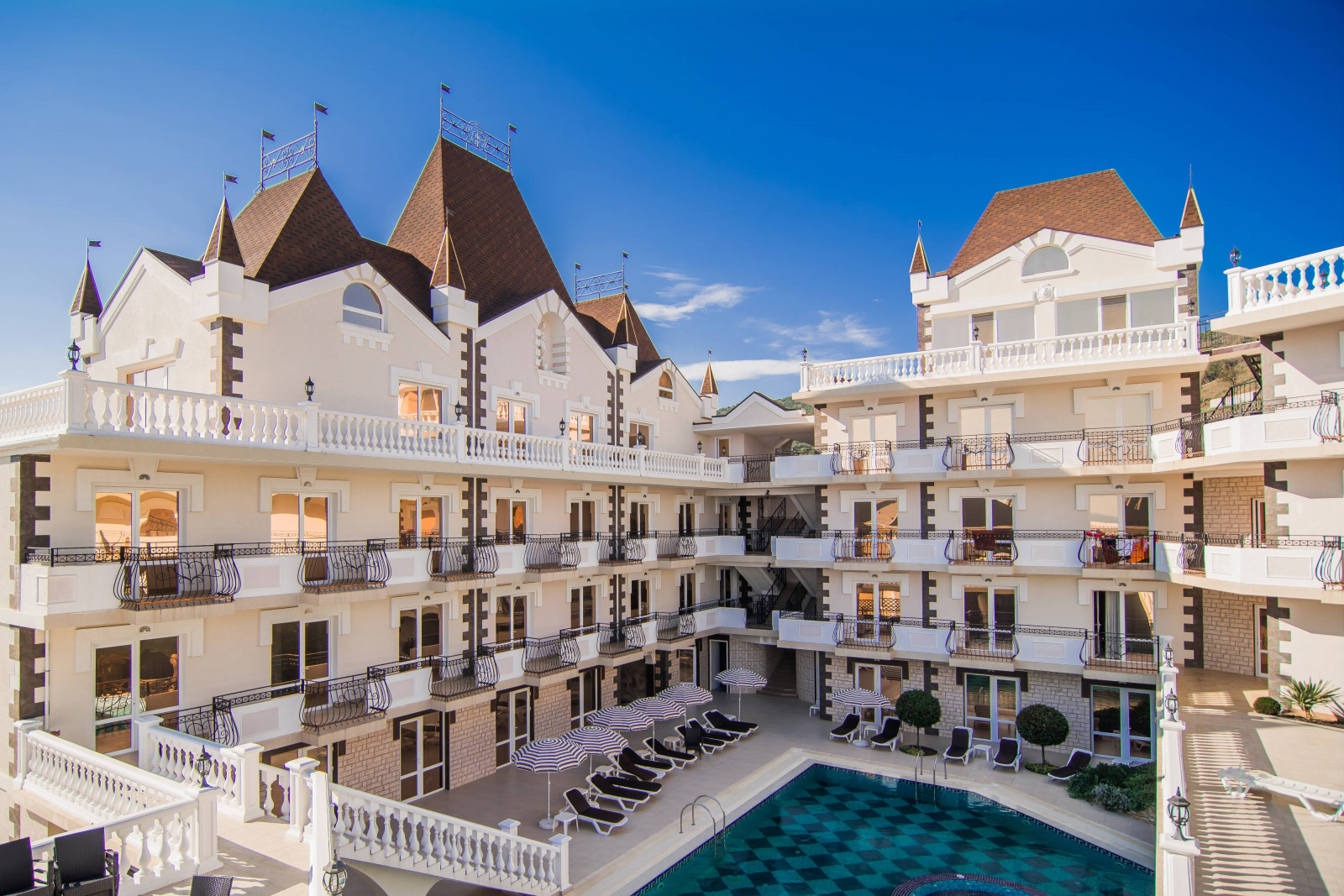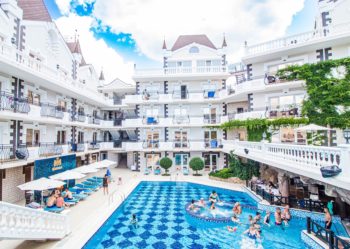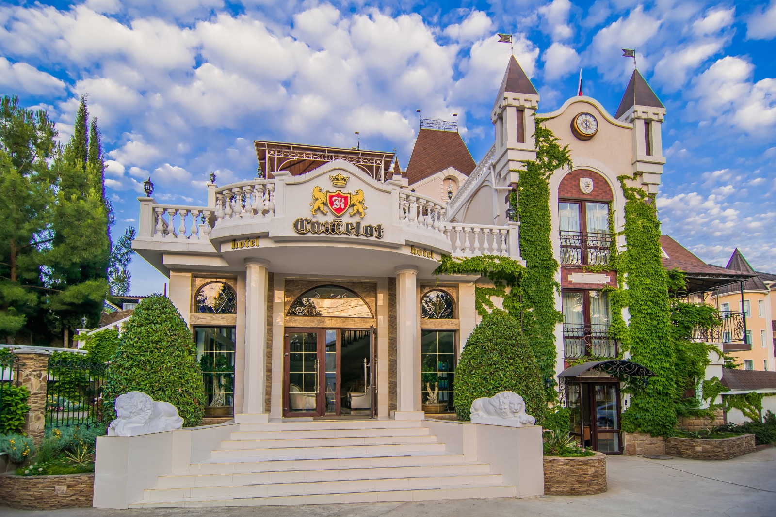 Отель «Камелот» в Крыму - архитектурный ансамбль, воплощающий все представления о средневековом замке и рыцарях круглого стола. Расположен на Южном берегу Крыма в 25 км от города Алушта в поселке Малореченское. Отель предлагает на выбор 60 номеров разного уровня. В каждом номере – кондиционер и холодильник, кабельное ТВ и Wi-Fi, сейф и фен, парфюмерные наборы и полотенца. В распоряжении гостей – необходимая мебель и современный санузел, с горячей и холодной водой круглосуточно. Можно воспользоваться открытым бассейном и СПА-центром (на соседней вилле «Арго»), детской площадкой и экскурсионным бюро, рестораном и бильярдом (на набережной). Напрокат в отеле также можно взять велосипед. Для гостей, кто прибыл на личном автомобиле имеется парковка возле корпуса. На пляже есть все необходимое для морского отдыха: зонты и столики, шезлонги и кабинки для переодевания. Купаться и загорать гости отеля «Камелот» могут в прибрежной зоне центра «Кураж»: море – всего в 500 метрах.